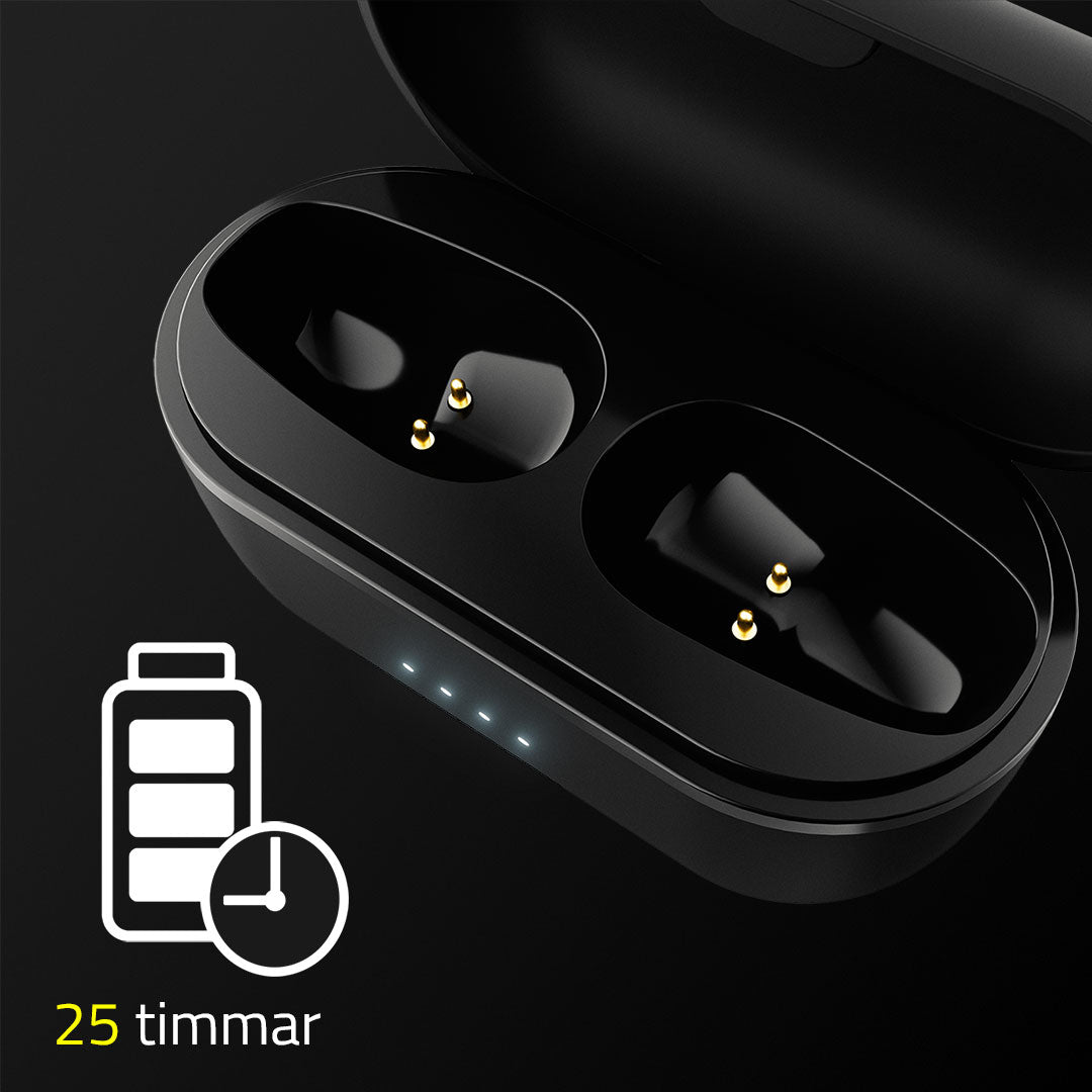 Zero-TX est équipé de batteries à haute efficacité qui offrent une très bonne performance par rapport à la taille et au poids. Malgré le format compact sur les écouteurs et les cas de charge, le temps de jeu est en charge de +5 heures. Vous pouvez ensuite charger les écouteurs 4 fois dans le cas de charge, ce qui donne un temps de jeu total de 25 heures.